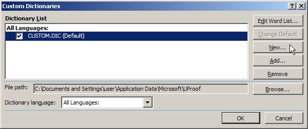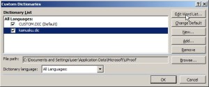 2. Di dalam kotak dialog Custom Dictionary, pilih kamusku.dic.