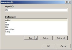 Ini baru langkah awal. Daftar ini harus segera diisi agar lengih lengkap. Cara yang mudah adalah dengan memanfaatkan dokumen yang sudah dikoreksi dan sedikit kesalahan ketiknya. Perhatikan bahwa kata yang ditambahkan harus berhuruf kecil semua, kecuali nama orang, nama kota, nama negara, atau nama entitas lainnya.