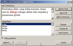 Secara default MS Word akan mengkoreksi ejaan dalam bahasa Inggris, ini karena language diset dalam bahasa Inggris (English). Prinsipnya sebenarnya sederhana. MS Word akan mencocokkan setiap kata yang kita ketik dengan kata-kata yang ada di dalam database Dictionary. Jika ada kata-kata yang tidak cocok dengan di dalam database, MS Word akan member garis bawah berwarna merah. Sayangnya fitur ini tidak banyak berfungsi untuk bahasa Indonesia (limited support).