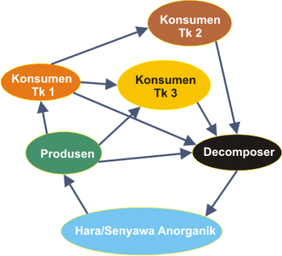 Salah satu siklus yang kita kenal adalah Rantai Makanan, yaitu proses makan memakan dalam dunia mahluk hidup. Kita awali dari yang paling bawah, yaitu tanaman. Tanaman menyerap sari makanan dari dalam tanah dan udara. Dengan bantuan sinar sang mentari, dia merubah sari makanan itu menjadi molekul-molekul besar yang kita sebut saja, molekul organik. Molekul ini menyusun tubuh tumbuhan. Jadilah tumbuhan itu tumbuh dan berkembang menjadi besar. Tumbuhan ini kita sebut saja PRODUSEN. Hanya kelompok produsen ini lah yang bisa merubah zat-zat kimia dasar menjadi molekul organik.