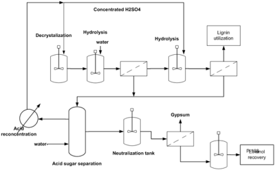 Perbedaan hidrolisis asam pekat dengan hidrolisis asam encer dapat dilihat dalam gambar di bawah ini. Hidrolisis asam pekat meliputi proses dekristalisasi selulosa dengan asam pekat dan dilanjutkan dengan hidrolisis selulosa dengan asam encer. Tantangan utama dari teknologi ini adalah pemisahan gula dengan asam, recovery asam, dan rekonsentrasi asam. Perhatikan gambar di bawah ini: