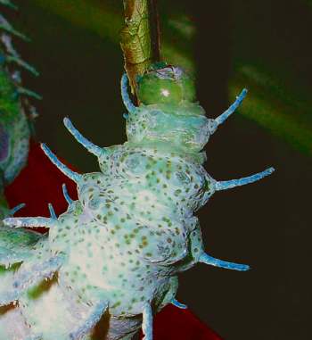 Ternyata ulat kupu-kupu gajah juga sebanding dengan kupu-kupunya gede, gede banget bo… Ulat ini berwarna hijau muda dan ada seperti duri-duri. Tetapi duri ini sebenarnya lunak, mungkin cuma untuk menakut-nakuti pemangsa. Padahal kalau lihat bentuknya aja, hampir dapat dipastikan banyak orang yang ‘gilo’. Apalagi ibu-ibu, para cewek, dan anak-anak.