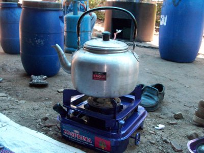 Kemudian pelatihan dilanjutkan dengan cara mengoperasikan distilator. Sebelumnya saya sudah menyiapkan nira yang sudah difermentasi sebanyak 100 L. Nira ini segera dimasukkan ke dalam ketel evaporator (penguapan). Kemudian diisi air. Setelah itu dipanaskan dengan kompor LPG. Dalam pelatihan ini kita memang menggunakan kompor LPG, tetapi pemanas bisa menggunakan berbagai macam bahan bakar, seperti kayu bakar atau batubara.