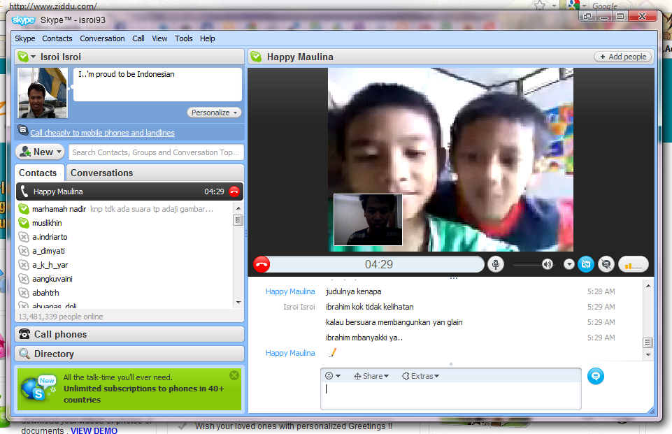 Hari-hari berikutnya, ngobrol via Skype. Pulsa telepon bisa ditekan lebih rendah. Demi Skype, orang rumah pasang Speedy, tidak ada pilihan lain yang lebih baik. Hari minggu pagi, saya janjian Online dengan keluarga. Jam 5 pagi, habis sholat subuh laptop sudah dihidupkan. Nunggu video call dari negeri tercinta di seberang benua sana.