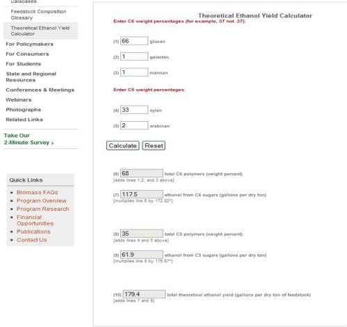 NREL, National Renewable Energy Laboratory dari negeri Paman Sam, menyediakan web calculator untuk menghitung hasil teoritik (theoritical yield) etanol dari biomassa lignosellulosa. Kalau Anda memiliki bahan baku biomassa dan ingin tahu berapa (secara teori) ethanol yang bisa dihasilkan dari biomassa itu, Anda bisa mencoba fasilitas ini. Silahkan kunjungi: http://www1.eere.energy.gov/biomass/ethanol_yield_calculator.html.