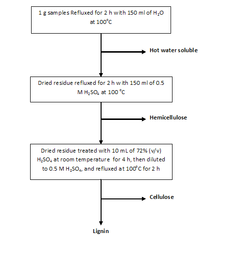 Ada metode lama yang bisa digunakan dengan peralatan laboratorium yang relatif mudah di dapat dan lebih murah. Memang metode ini ada kelemahannya, namun setidaknya bisa digunakan untuk memprediksi kandungan lignin, selulosa, dan hemiselulosa. Metode ini dijelaskan oleh Datta (1981) yang dimodifikasi dari metode yang dijelaskan oleh Chesson (1978). Prinsip dasar dari metode ini adalah gravimetri, jadi berdasarkan berat biomassa yang hilang. Biomassa dihidolisis secara bertahap dengan menggunakan asam sulfat. Tahapa utama metode ini bisa dilihat di dalam gambar di bawah ini.