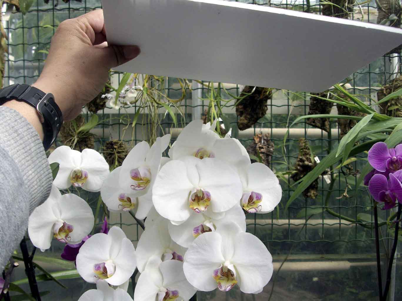 Letakkan dan posisikan kertas putih di belakang bunga yang akan difoto. Atur jaraknya agar tidak terlalu dekat. Atur juga agar tidak ada bayangan yang menimpa kertas putih tersebut. Kalau masih ada bayangan, berarti cahayanya masih terlalu kuat. Gunakan peneduh yang lebih lebar. Kertas bisa ditaruh jika memungkinkan, atau minta tolong teman untuk memegang latar belakang ini, atau pegang pakai tangan Anda sediri seperti yang saya lakukan ini.