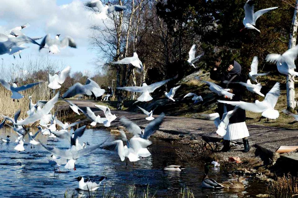 Memberi makan burung camar di tepian danau Svartemossa
