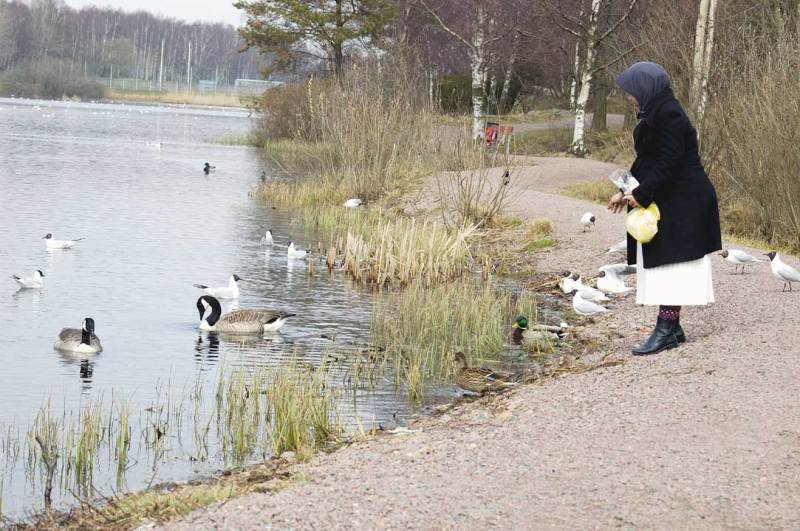Memberi makan bebek, angsa, merpati, dan burung camar di tepian danau Svartemossa. Hari kamis pagi. Sorenya umminya sudah harus masuk ke rumah bersalin.