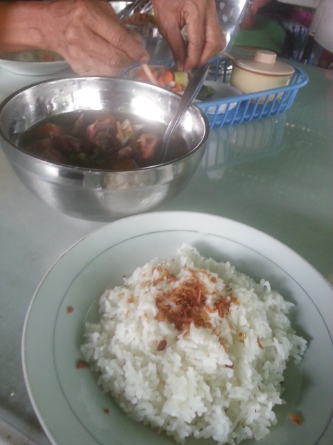 Jangan salah kira dulu. Justru itu keistimewaan sop buntutnya Mak Emun, dagingnya memang masih merah tapi empuk banget dan gampang lepas dari tulangnya.