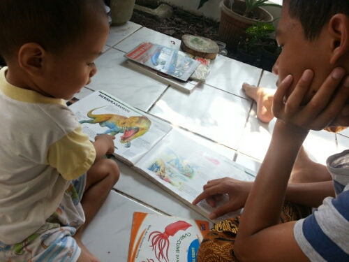 Sore atau malam kami biasanya duduk2 lesehan di teras rumah, bercanda, membaca buku, atau sekedar ngobrol sama anak2.