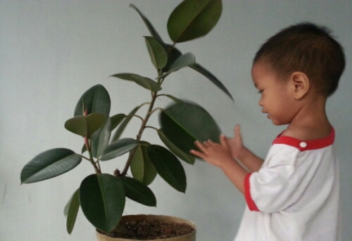 Ternyata bukan cuma saya yang suka tanaman Ficus elastica ini. Yusuf juga senang dengan tanaman ini. Kadang Yusuf memeluknya, mengelus-elus daunnya, menciumnya dan mengajaknya mengobrol. Yusuf juga suka menyirami tanaman ini.