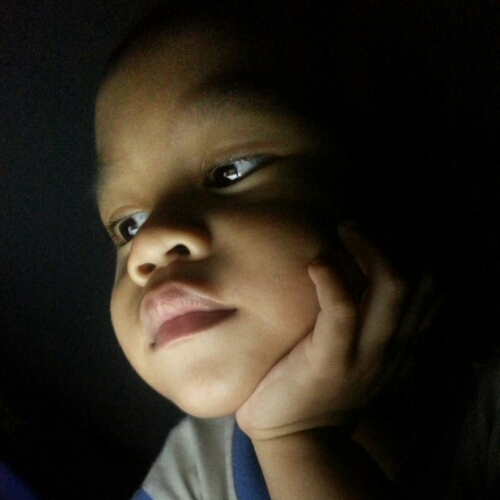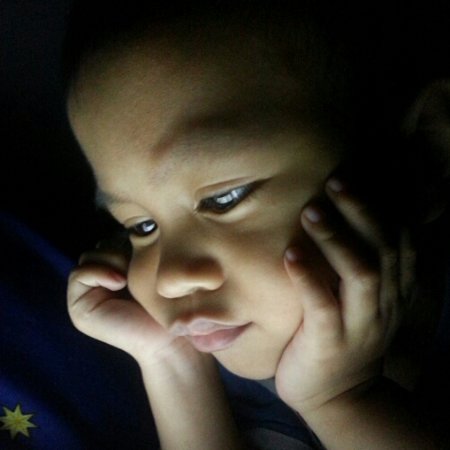 Foto ini saya ambil sekitar pukul 1 dini hari. Yusuf belum tidur dan asik melihat film larva di YouTube. Lampu kamar dimatikan agar dia segera tidur. Saya lihat cahaya iPad menerangi wajah Yusuf dan terlihat artistik. Saya segera ambil fotonya. Posisinya agak sulit dan Yusuf tidak mau diarahkan.
