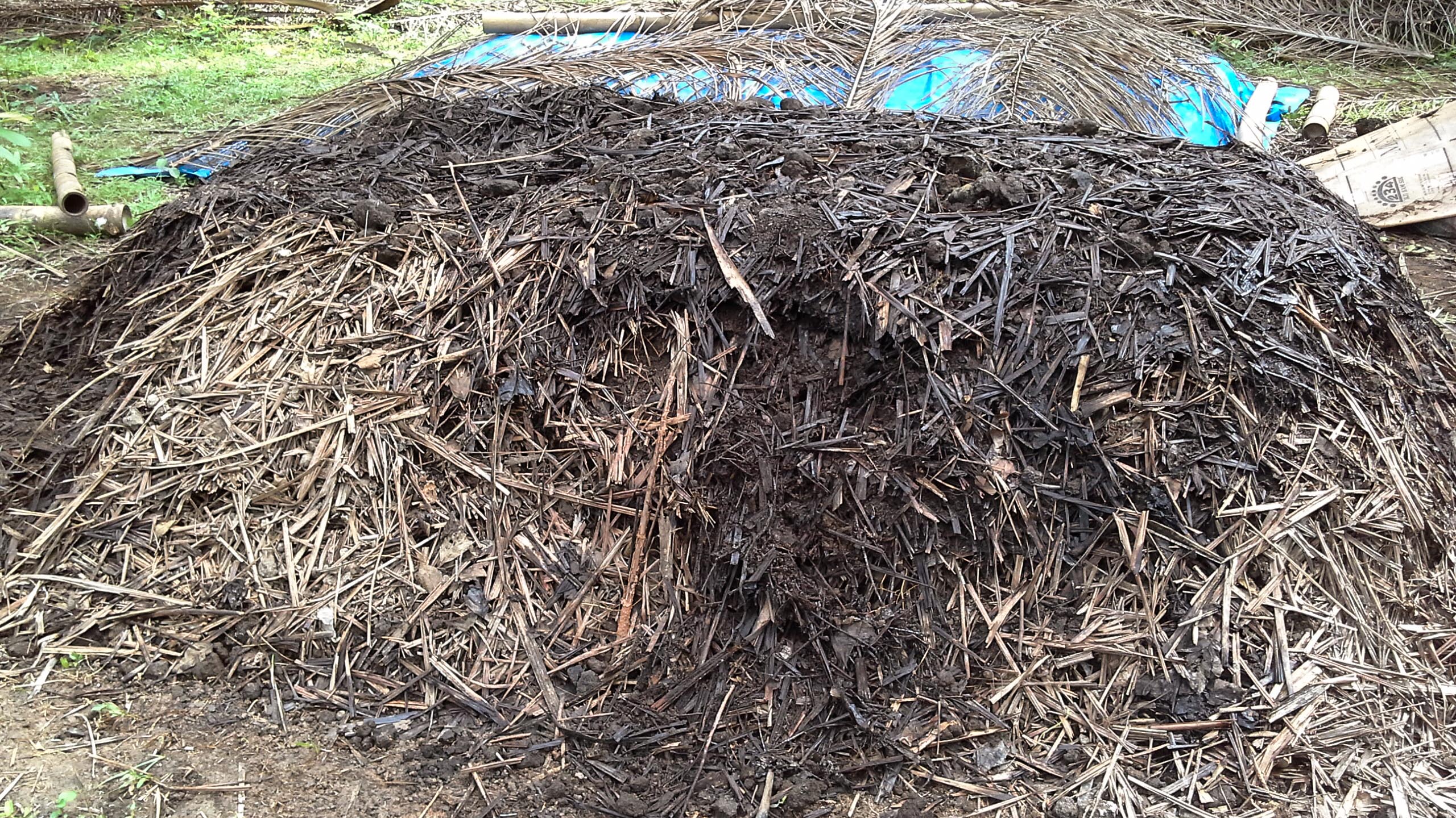 Kompos dipanen setelah berumur kurang lebih satu bulan. Tinggi tumpukan kompos turun kurang lebih setengahnya dan pelepah sudah hancur.