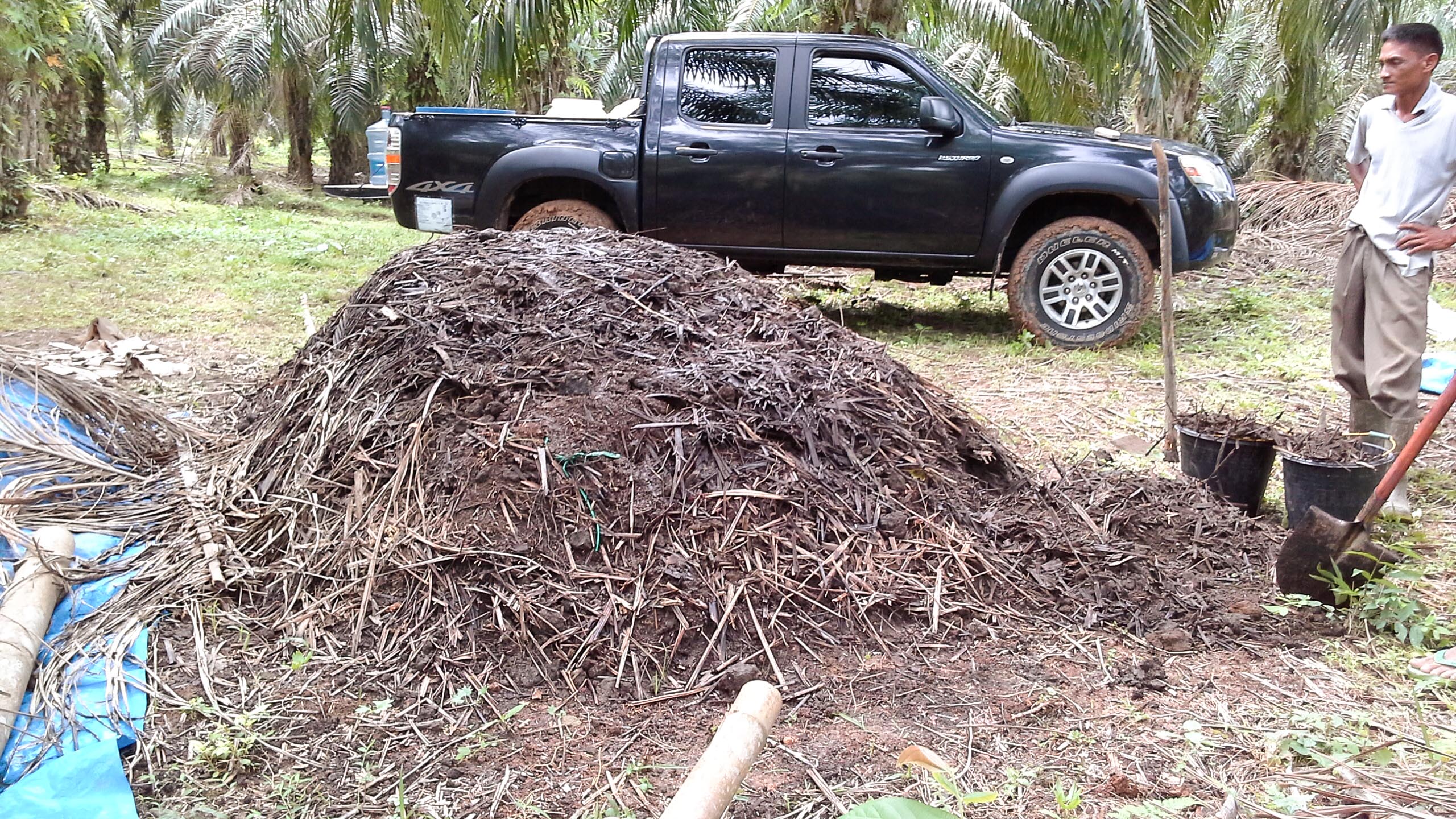 Salah satu limbah biomassa yang banyak terdapat di kebun sawit adalah sisa pangkasan pelepah sawit. Pelepah sawit yang sudah tua dan menguning akan dipangkas dan ditumpuk di kebun sawit. Sisa pangkasan ini hanya dibiarkan saja dan tidak dimanfaatkan. Sisa pangkasan pelepah sawit bisa dibuat kompos dan digunakan untuk memupuk tanaman sawit. Pengomposan pelepah sawit dengan Promi sangat sederhana dan mudah dilakukan. Berikut ini adalah cara pengomposan pelepah sawit dengan menggunakan Promi yang dilakukan oleh Bp. Cut Zaini di Aceh. Bapak Cut Zaini memiliki kebun sawit seluas 40 ha dan sudah berumur kurang lebih 15 tahun dan ada juga yang masih TBM. Dalam pengomposan ini Bapak Cut Zaini juga menggunakan kotoran sapi, karena kebetulan harga kotoran sapi di tempat tersebut sangat murah dan tersedia melimpah. Pengomposan pelepah sawit bisa dilakukan tanpa menggunakan kotoran sapi, namun jika ada bahan tambahan seperti kotoran sapi akan lebih baik.