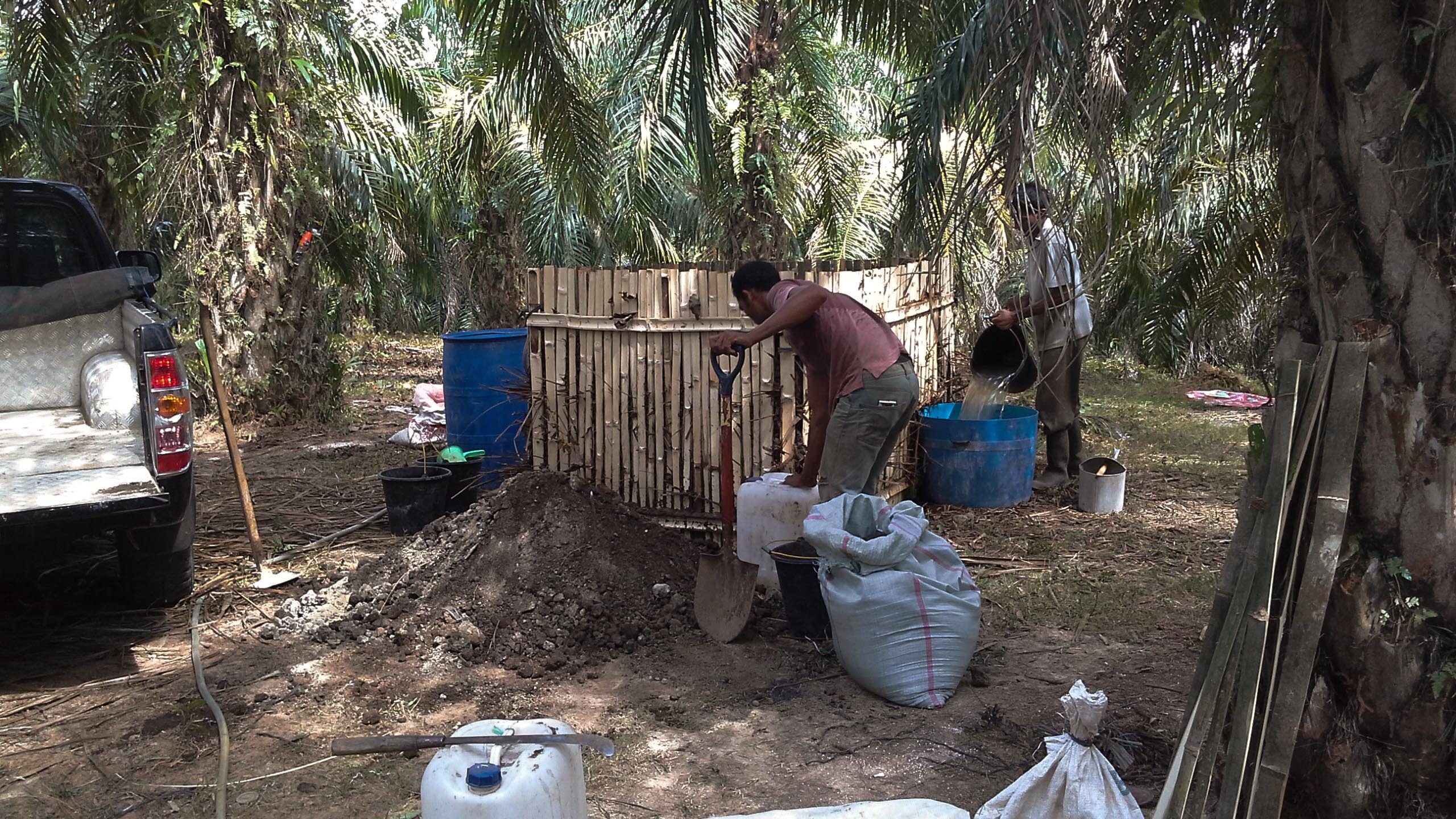 Masukkan pelepah sawit ke dalam cetakan selapis. Injak-injak sampai benar-benar padat.