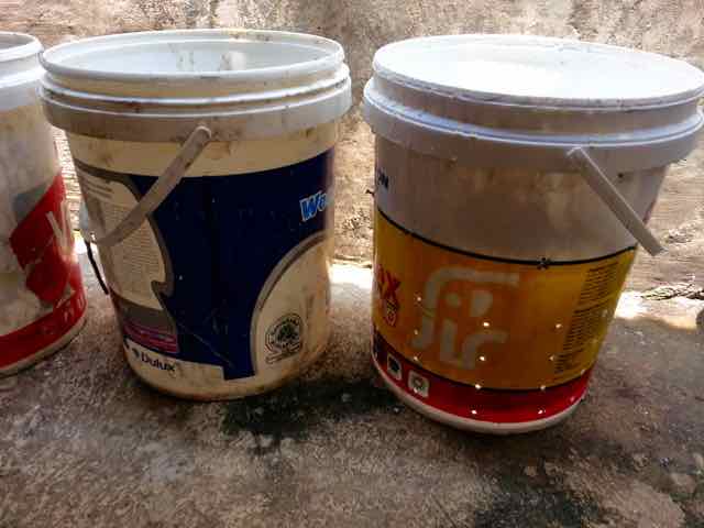 6. Tempat cat yang berlubang-lubang ini ditumpukkan di atas tempat bekas cat yang satunya lagi.