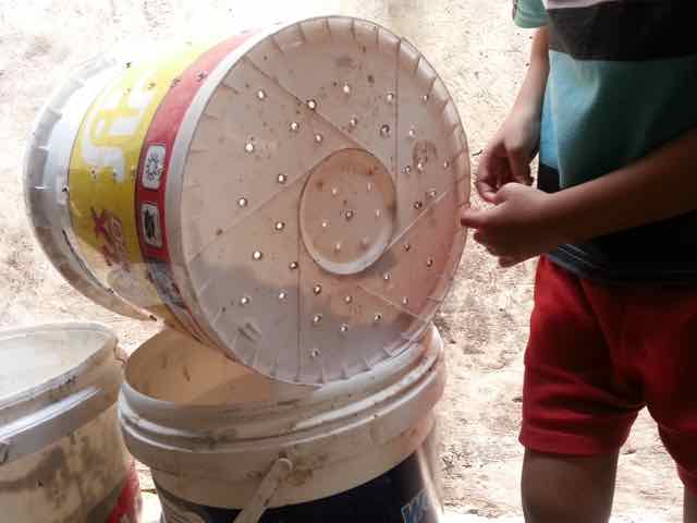 8. Jika komposter sudah penuh, bagian atas diangkat dan dimasukkan bekas tempat cat/komposter yang lain.