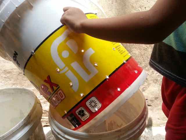 2. Salah satu tempat bekas cat, dideri lubang di bagian atas dengan paku/besi yang dipanaskan atau dengan bor. Lubang-lubang ini untuk mengalirkan air yang ada di dalam sampah organik rumah.