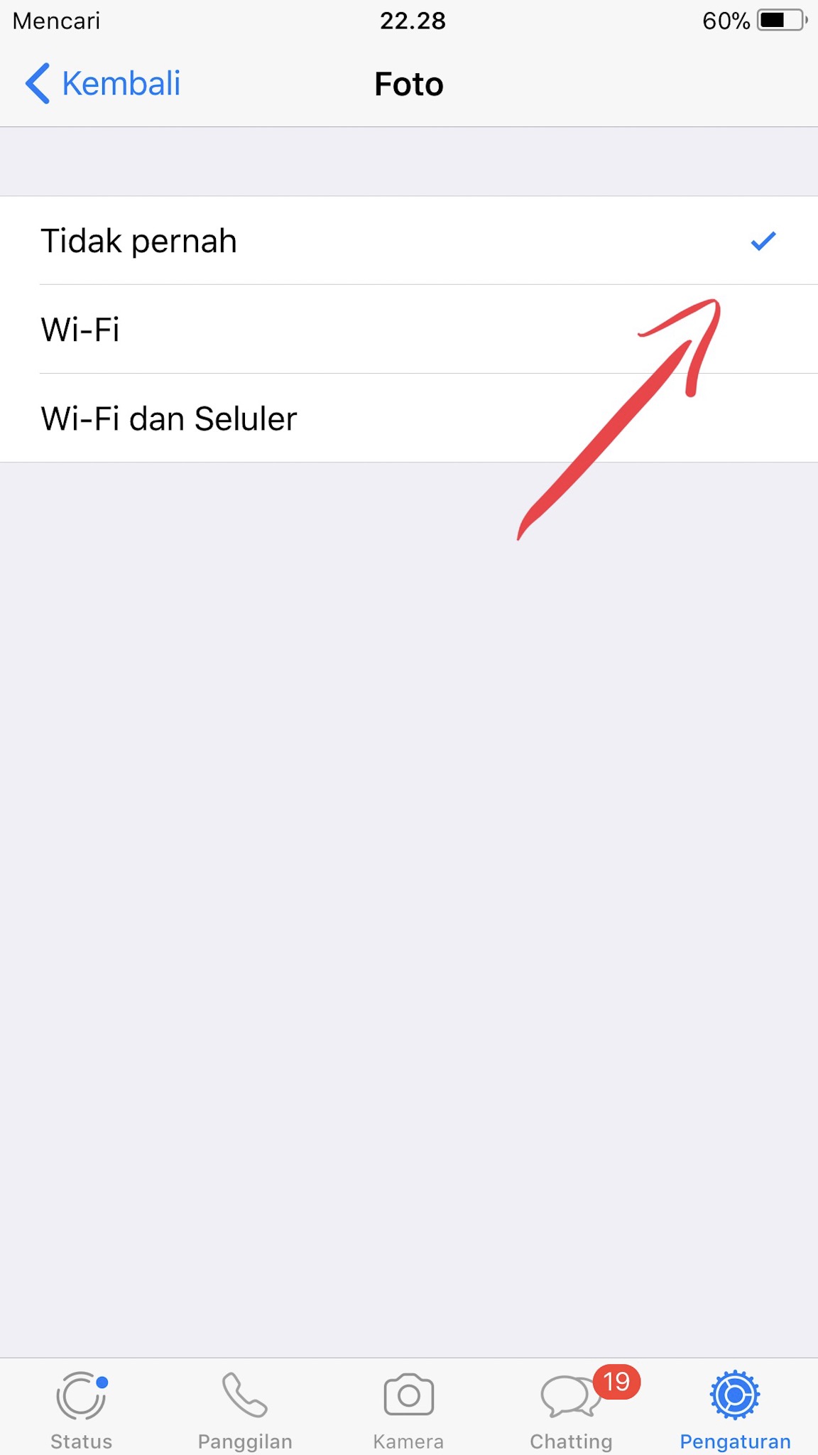 Klik/sentuh setiap pilihan media dan atur menjadi “Tidak Pernah” agar WA tidak mendoanload secara otomatis konten media tersebut.