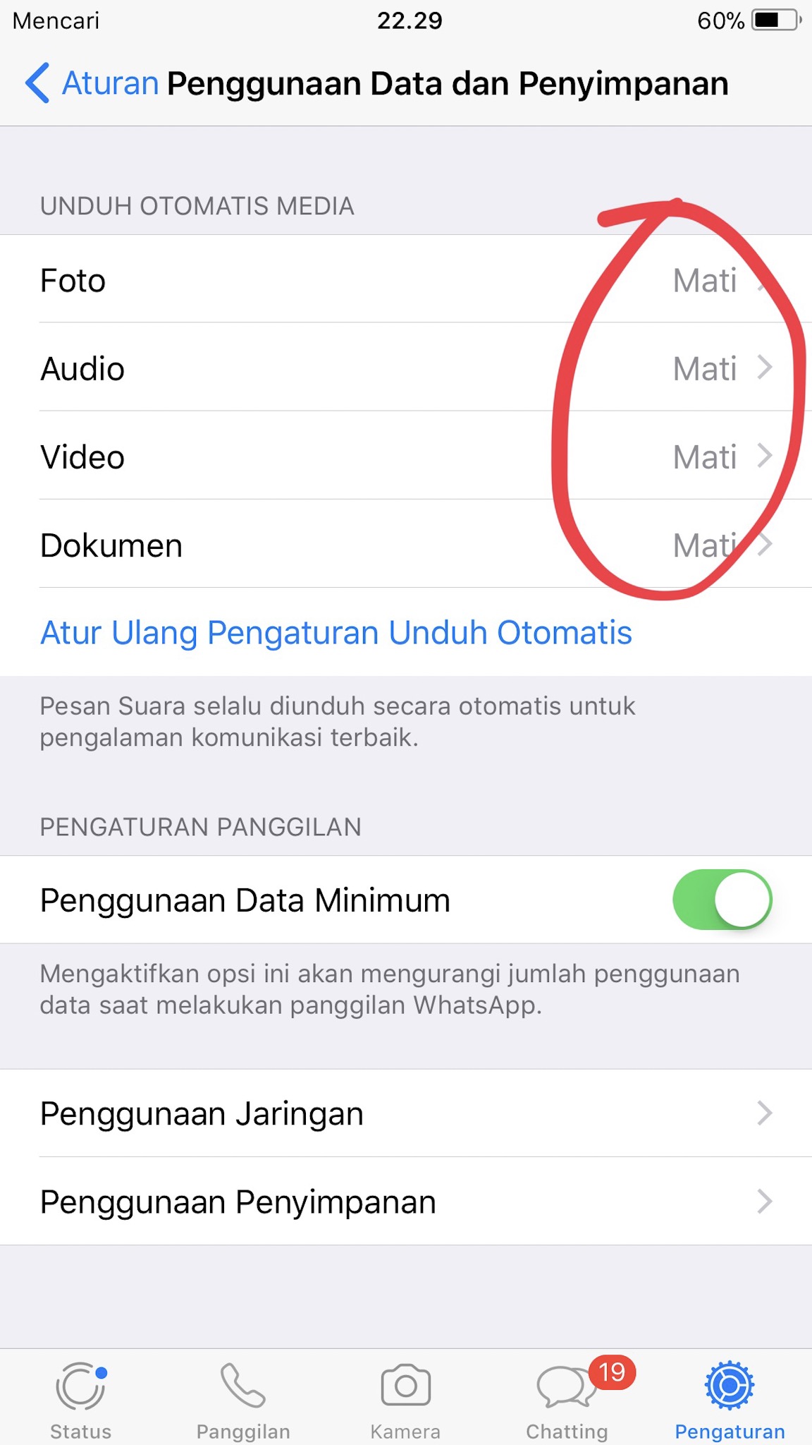 Pengaturan default WA yang akan mengunduh secara otomatis media-media yang dikirimkan via WA. Pengaturan ini salah satu yang menyebabkan WA cepat bengkak memorinya.