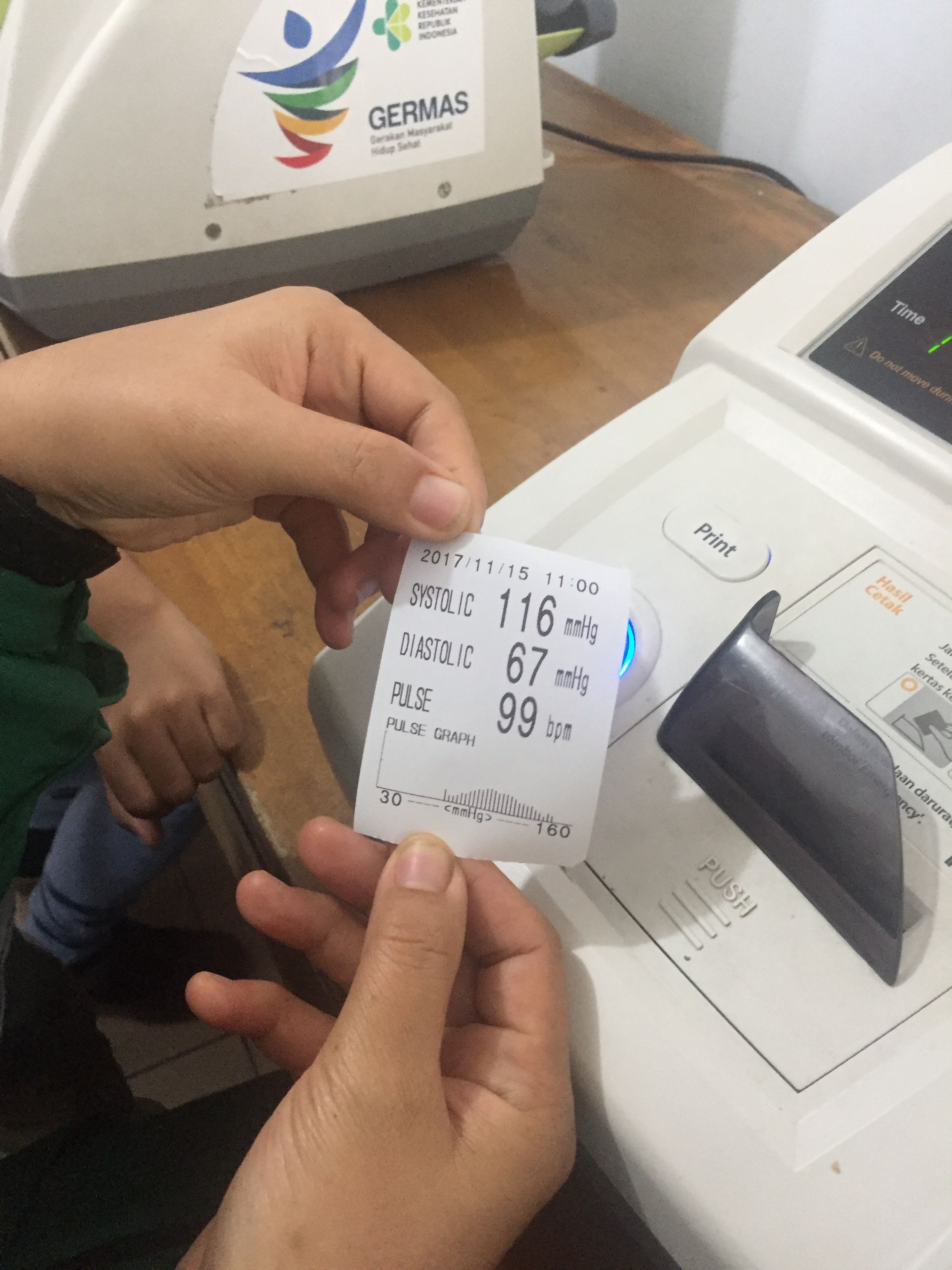 Di loket pendafaran kita akan diberi beberapa isian tambahan. Kita isi formulir itu. Lalu, cek tekanan darah dengan mesin cek tekanan darah otomatis. Struk dari mesin tekanan darah kita lampirkan di formulir kita.