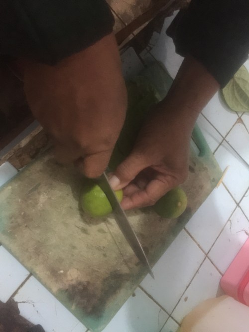1. Jeruk nipis dibelah dua; tapi tidak sampai terpotong.