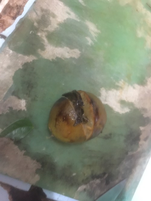 6. Jeruknya diperes, posisi daun sirihnya usahakan tetap menempel terjepit di dalam jeruk.