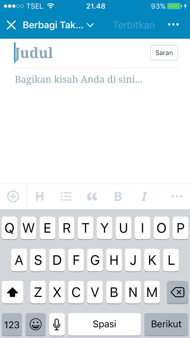 Jika kita ingin menulis artikel baru bisa menggunakan menu Pos-pos Blog dan sentuh icon + (tambah) yang ada di pojok kanan atas. Tampilannya sangat sederhana dan sangat mudah digunakan. Seperti gambar berikut ini tampilannya untuk menuliskan artikel baru: