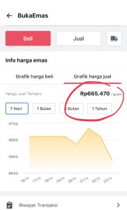 Di aplikasi Bukalapak juga ada perkembangan harga emas (jual dan beli) dalam 7 hari, 1 bulan, 3 bulan dan satu tahun. Jadi kita bisa tahu apakah harga sedang bergerak turun atau bergerak naik.
