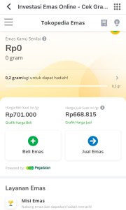 Saya perhatikan fitur-fitur di Tokopedia mirip-mirip dengan di Bukalapak. Yang menarik adalah harga beli dan harga jualnya. Di Tokopedia harga beli emasnya lebih murah dari harga di Bukalapak. Misalnya, saat ini harga beli di Tokopedia adalah Rp. 701.000/gr dan harga jualnya Rp. 668.815/gr. Selisihnya cukup jauh dengan harga di Bukalapak. Untuk harga kita beli saja ada selisih Rp. 1.301/gr atau 0,18%. Untuk harga jualnya juga lebih tinggi daripada harga di Bukalapak. Selisihnya lumayan besar, yaitu: Rp. 3.345/gr. Gede selisihnya.