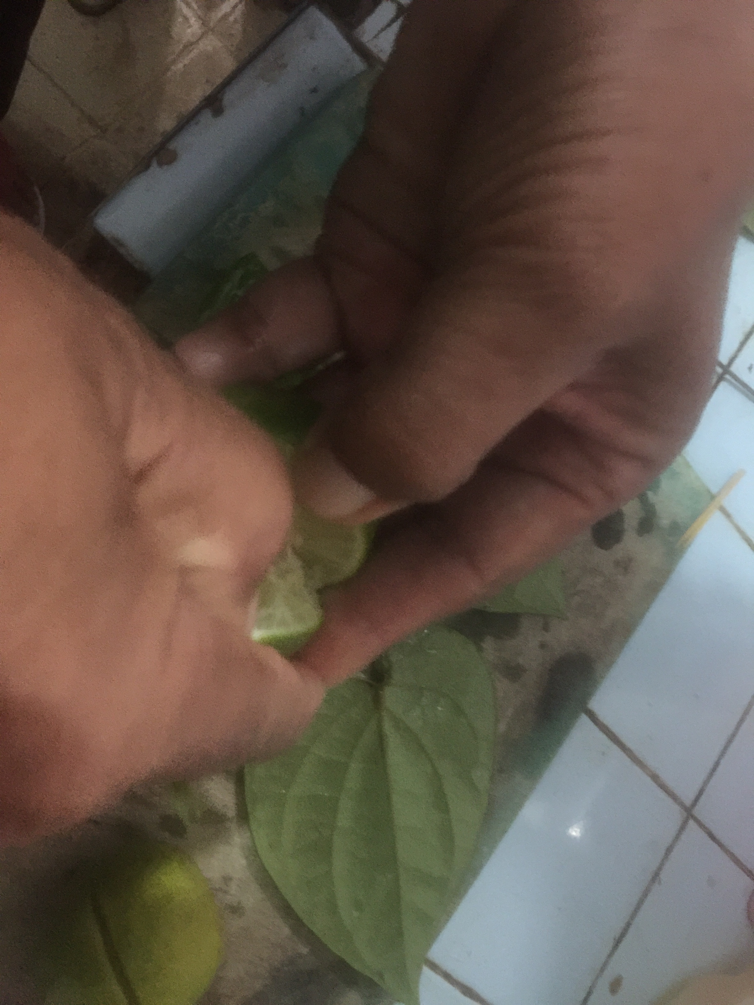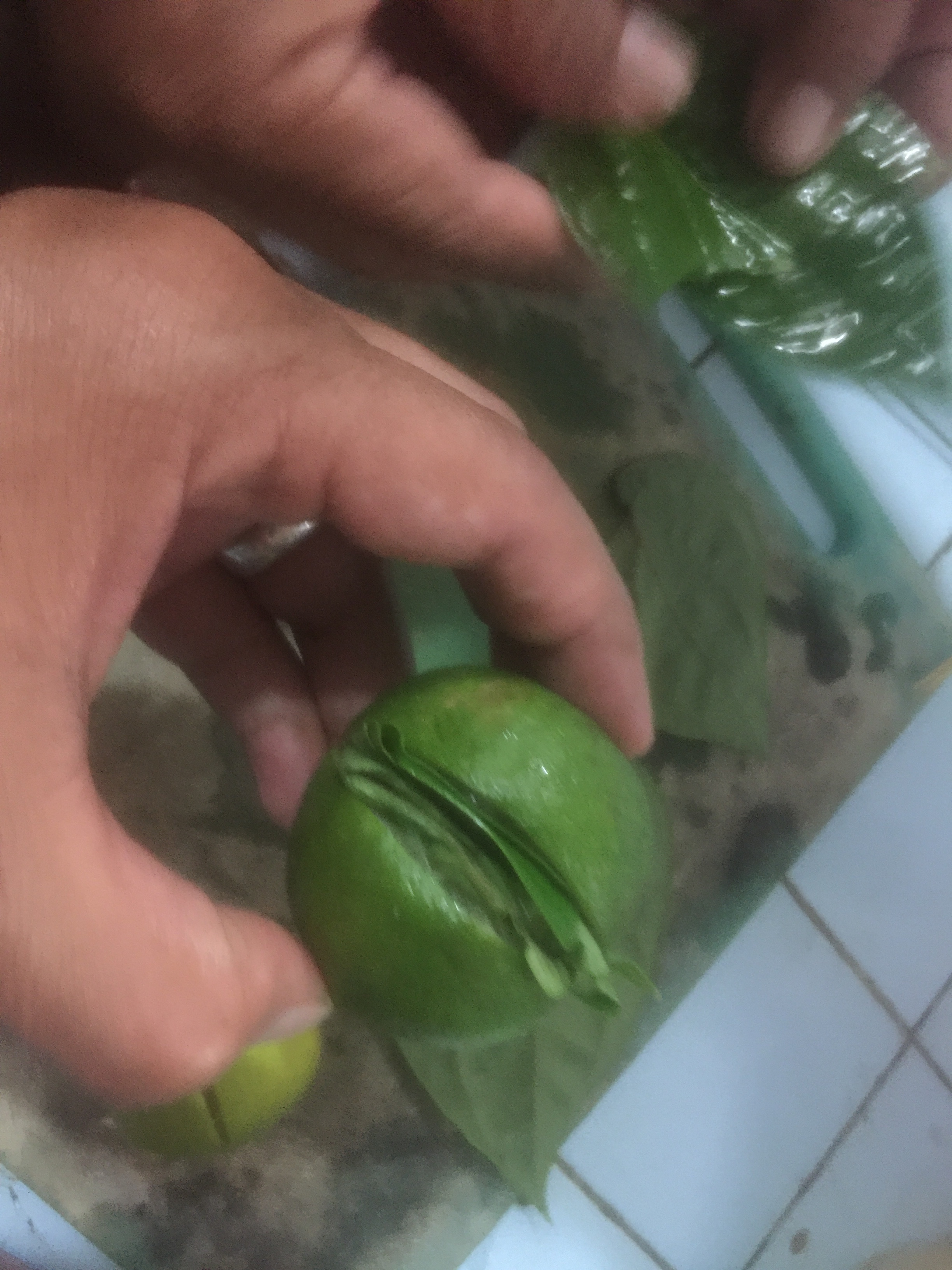 3. Daun sirih dipotong lalu dilipat dan dimasukkan ke dalam belahan jeruk nipis tadi.