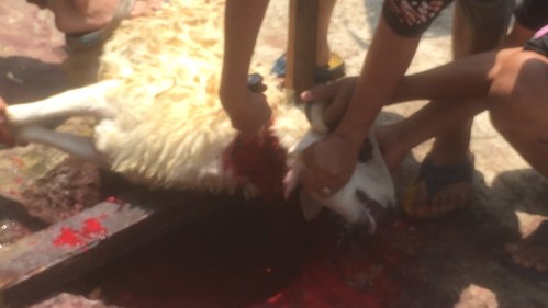 Pisau saya potong ke bawah. Pisaunya bener-bener tajam. Sekali sayat langsung putus kerongkongan dan tenggorokan domba ini.
