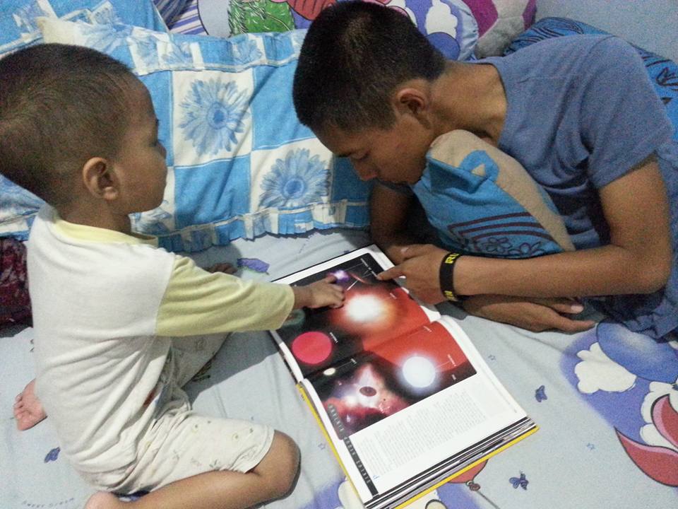 Di rumah ada banyak buku. Kami ajak mereka untuk membaca. Royan dan Abim saya minta mengajak adiknya untuk membaca buku dan bercerita apa saja tentang isi buku itu.