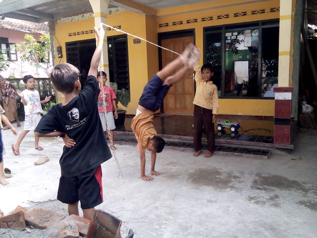 Permainan loncat tali. Permainan yang menyehatkan, melatih fisik, dan kemampuan sosial anak-anak.