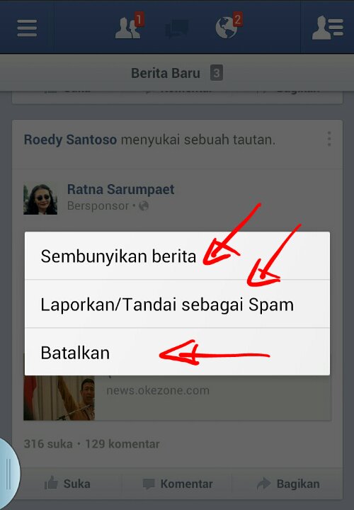 Contohnya saya tidak suka pada kiriman dari Ratna Sarumpaet ini. Saya pilih LAPORKAN/TANDAI SEBAGAI SPAM. Menu berikutnya memberikan beberapa pilihan. Saya memilih: SAYA TIDAK MENYUKAI KIRIMAN INI. Kemudian klik tombol LANJUTKAN. Menu berikutnya tersedia pilihan untuk mengirim pesan pada pengirim kiriman untuk menghapus kirimannya.