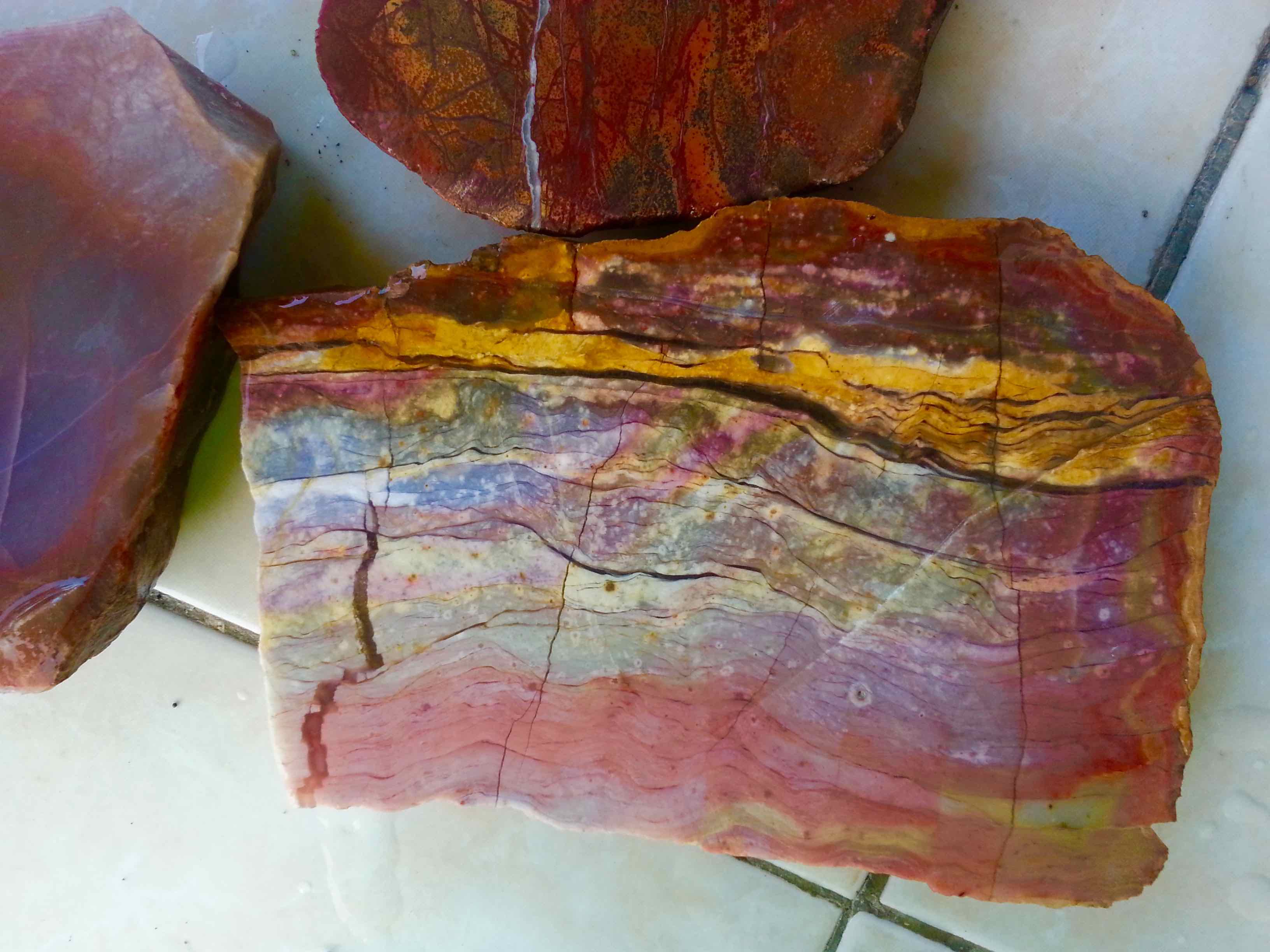 Batu akik dari Maluku Utara/Halmahera. Dari jempol: lavender, fosil kayu, Obi Merah, Obi Kuning, Obi Leci.