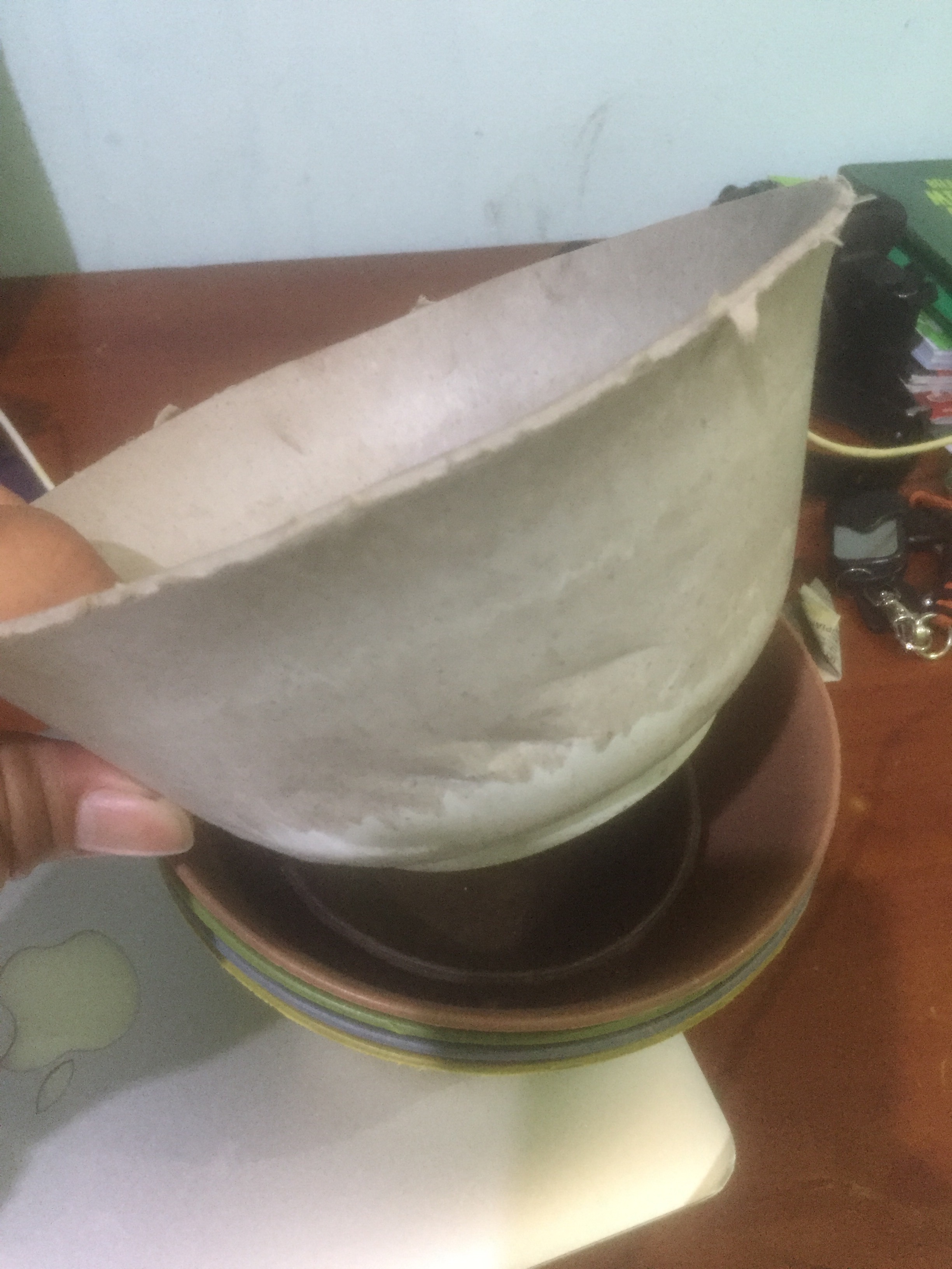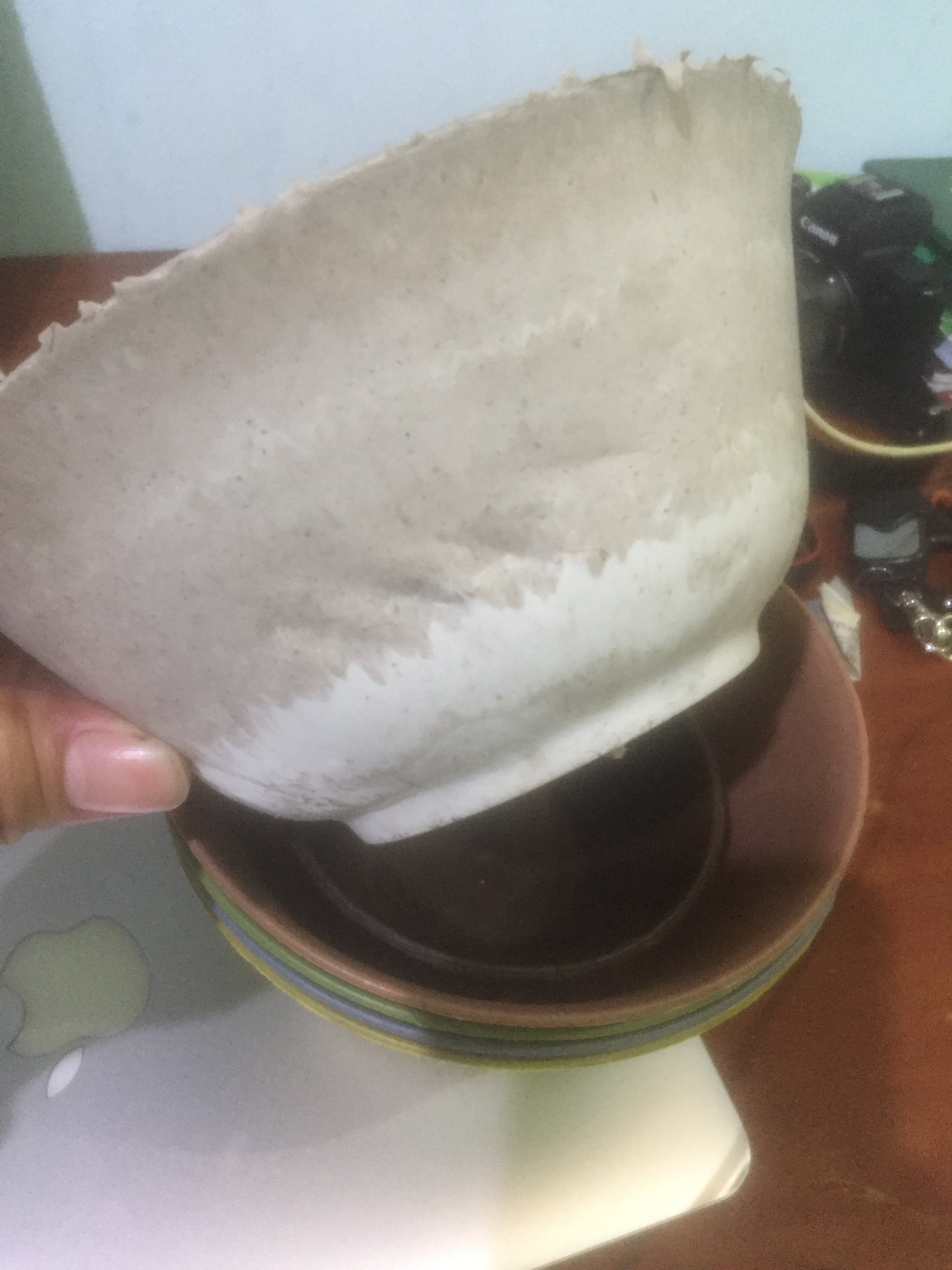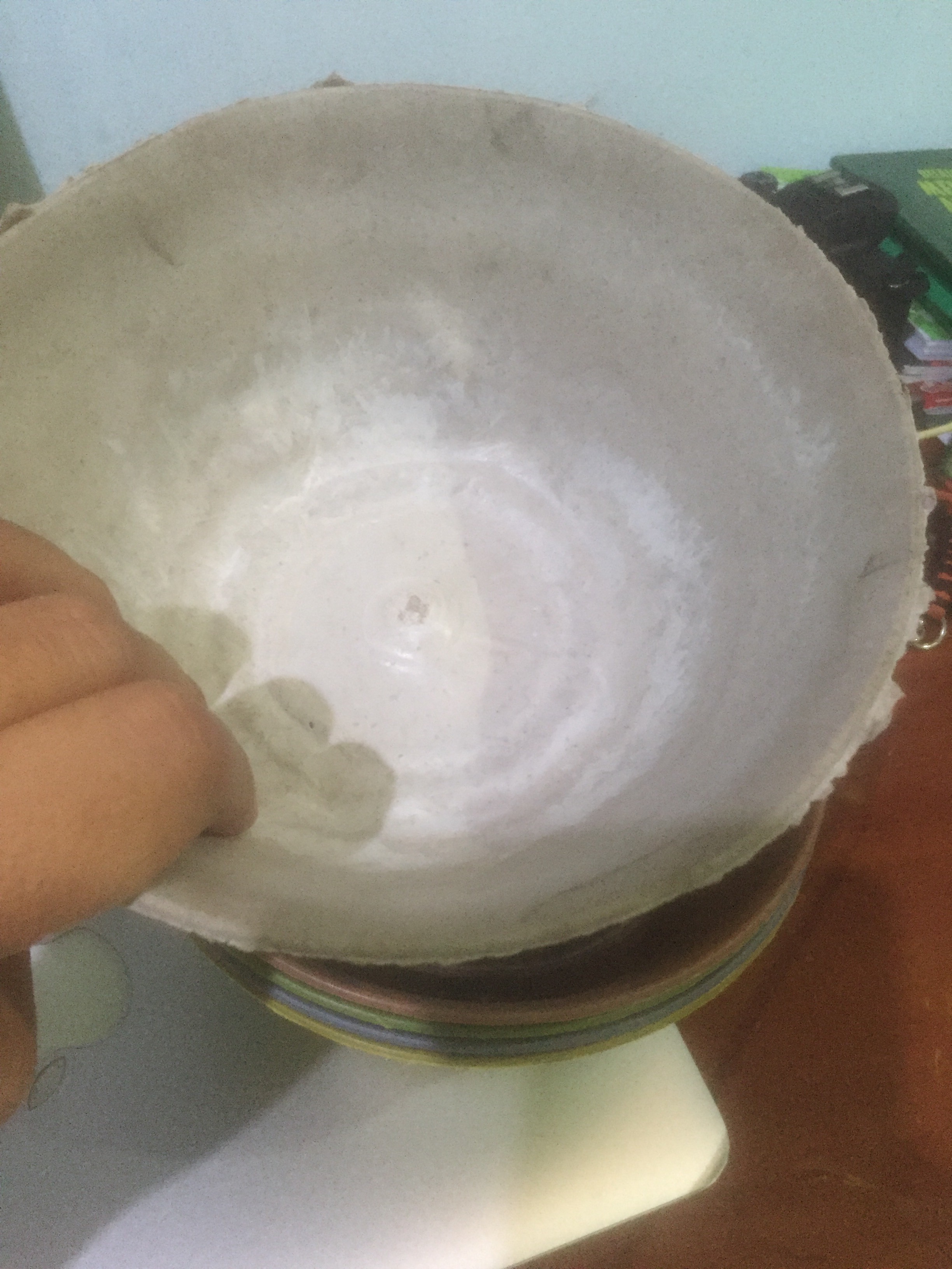 Mangkok ini sudah dibuang dan tersingkirikan. Hasil yang ditunjukkan ke saya adalah lembaran2 bioplastik gosong dengan bau tiwul yang menyengat.