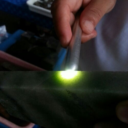 Giok dari Halmahera Timur yang berwarna putih dengan bercak hijau muda. Warnanya cantik dan tembus cahaya.