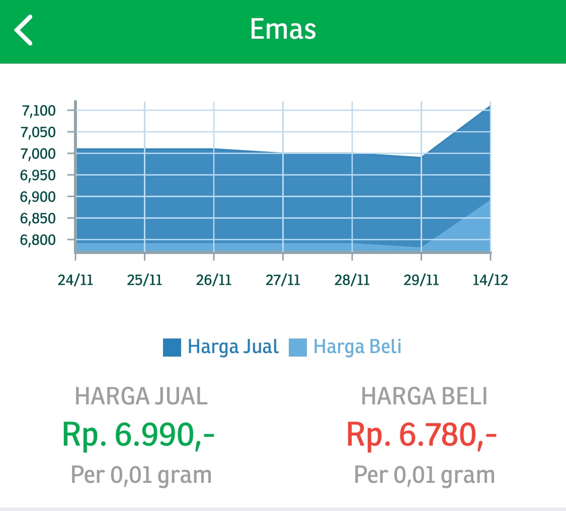 Informasi grafik harga di Pegadaian memang agak sedikit ‘kaku’. Tapi kalau kita jeli, justru harganya malah turun. Tadinya saya pikir hari ini akan ada kenaikan harga dari harga kemarin yang Rp. 7.000/0.01 gr,  hari ini malah turun menjadi Rp. 6.990/0.01 gr. Sedikit sih penurunannya. Tapi lumayan juga dalam jangka panjang. Selisihnya dengan Bukalapak lumayan lho Rp. 4.038/gr emas.