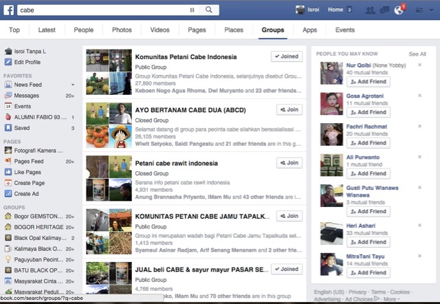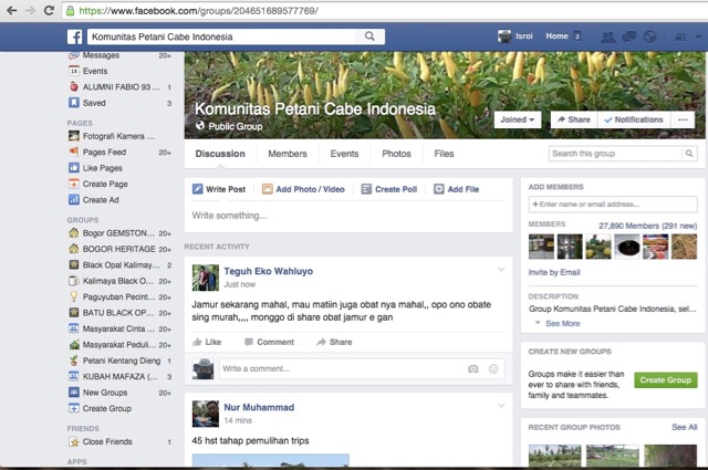 Disadari atau tidak penggunaan Facebook sudah berkembang sangat pesat. Lebih dari hanya sekedar ‘microblogging’ atau ‘update status’ saja. Fasilitas group di FB membuka banyak peluang yang mungkin tidak pernah terpikirkan. Orang-orang yang memiliki minat yang sama kemudian membuat group-group FB tersendiri. Termasuk orang-orang yang bergerak di dunia pertanian. Ada banyak group-group tentang pertanian. Ada yang umum ada, ada yang spesifik, bahkan sangat spesifik. Misalnya saja: Komunitas Petani Cabe Indonesia, Petani Cabe Rawit Indonesia, Komunitas Petani Jahe Indonesia, Gabungan Petani Singkong Indonesia, Petani Kentang Dieng.
